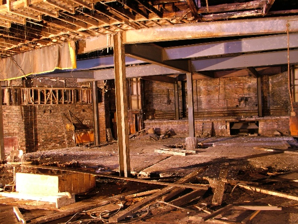 General view front stalls left from rear stalls, showing how structural steelwork was inserted after closure. Original front stalls left fire exit also visible